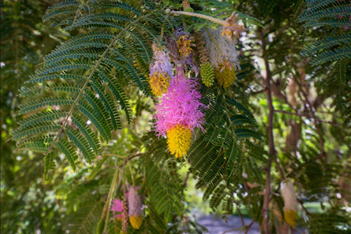 The pink and yellow blooms of this tree, known both as Chinese Lantern and Kalahari Christmas tree (Dichrostachys cinerea), bloom from summer to early winter.