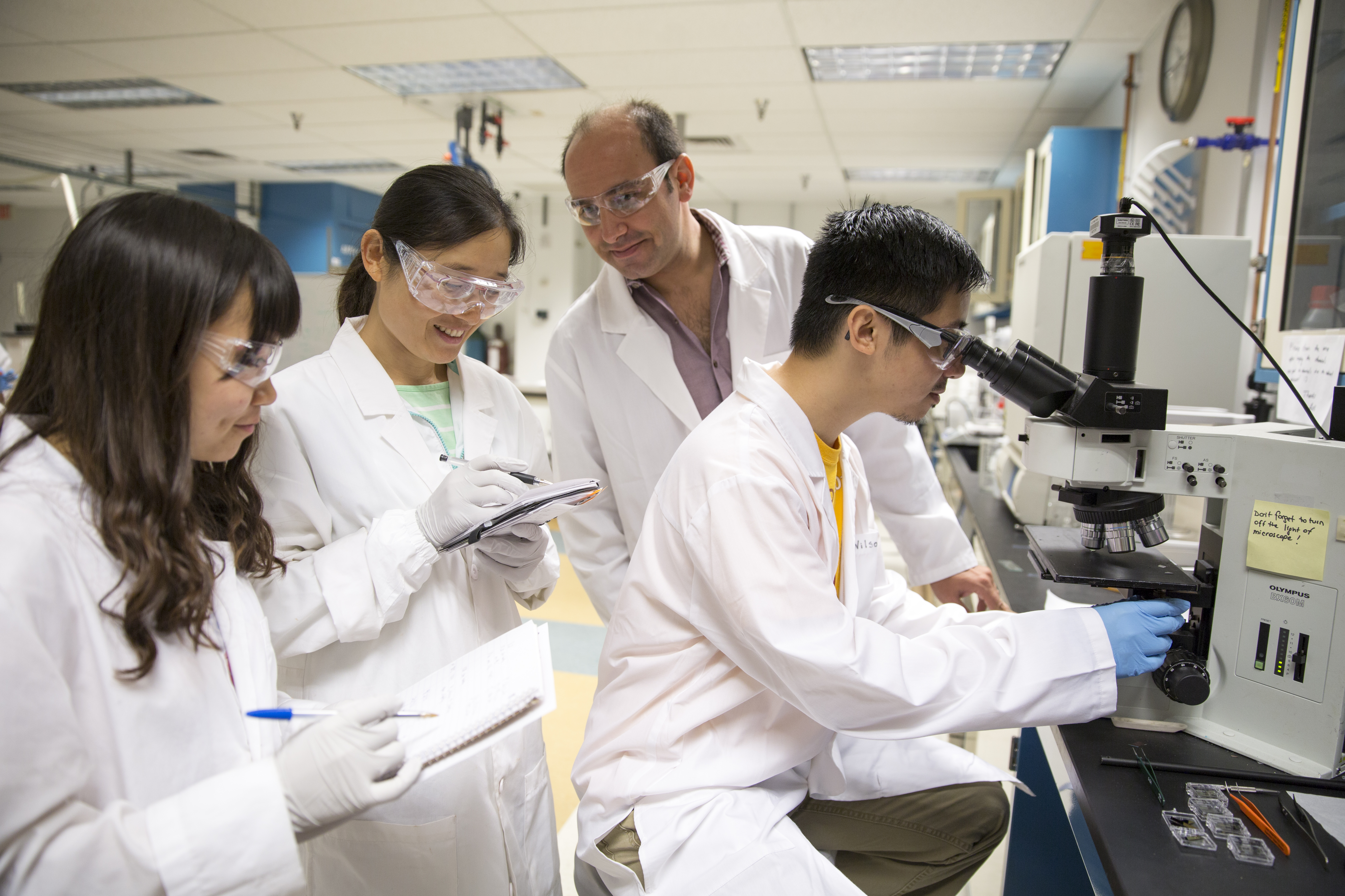 Top photo: Assistant professor of materials science and engineering Sefaattin Tongay (second from right) has earned a CAREER Award from the National Science Foundation to support his research on the use of 2-D materials to develop advances in a variety of technologies. The project provides opportunities for laboratory experience for graduate students and postgraduates. Pictured with Tongay are (from left) master’s student Xi Fan, postdoctoral researcher Xiuqing Meng and master’s student Wilson Kong. They are inspecting synthesized 2-D materials and discussing their findings. Photo by Jessica Hochreiter/ASU