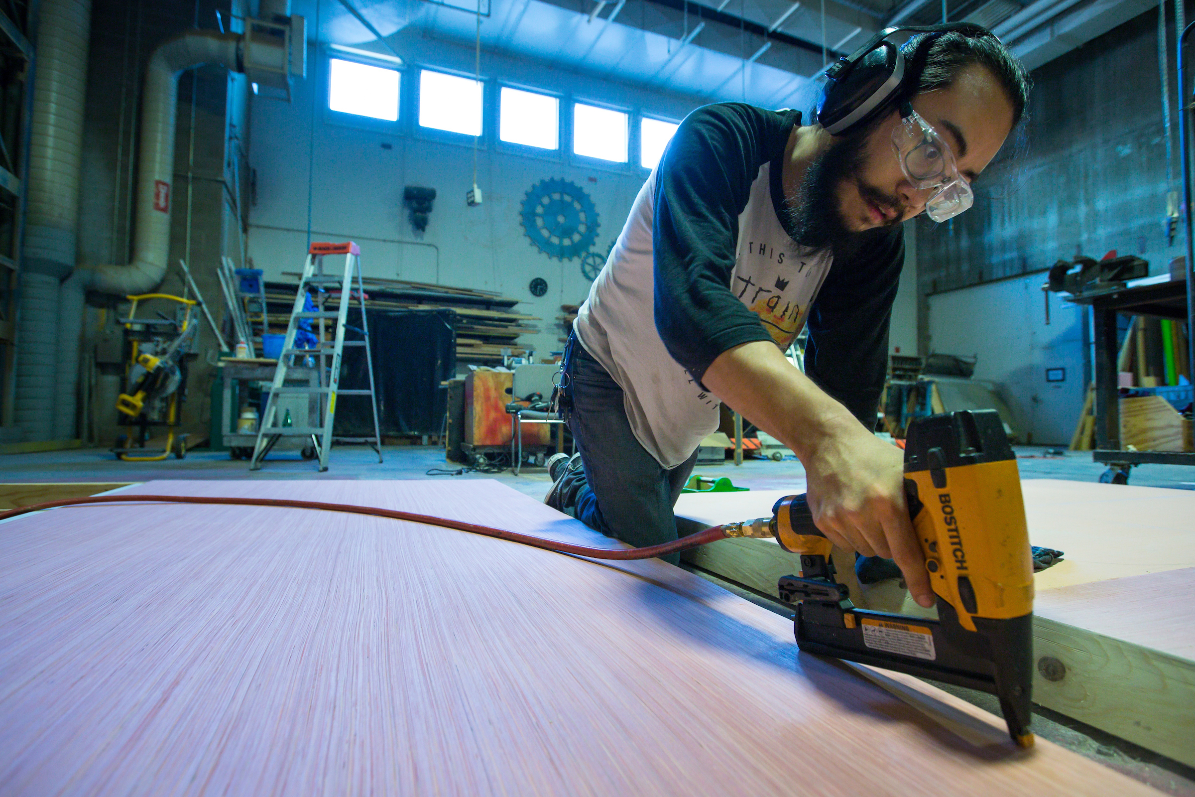 Technical director Anthony Lee said although he’s having fun, he’s under intense deadline pressure. This is also the 19-year-old sophomore’s first experience with an official stage production. He and about 20 other students from THP 231: Scenic Construction will build nine pieces of furniture — three wall units, five hanging windows and a mobile crawl space that can be wheeled on and off stage.