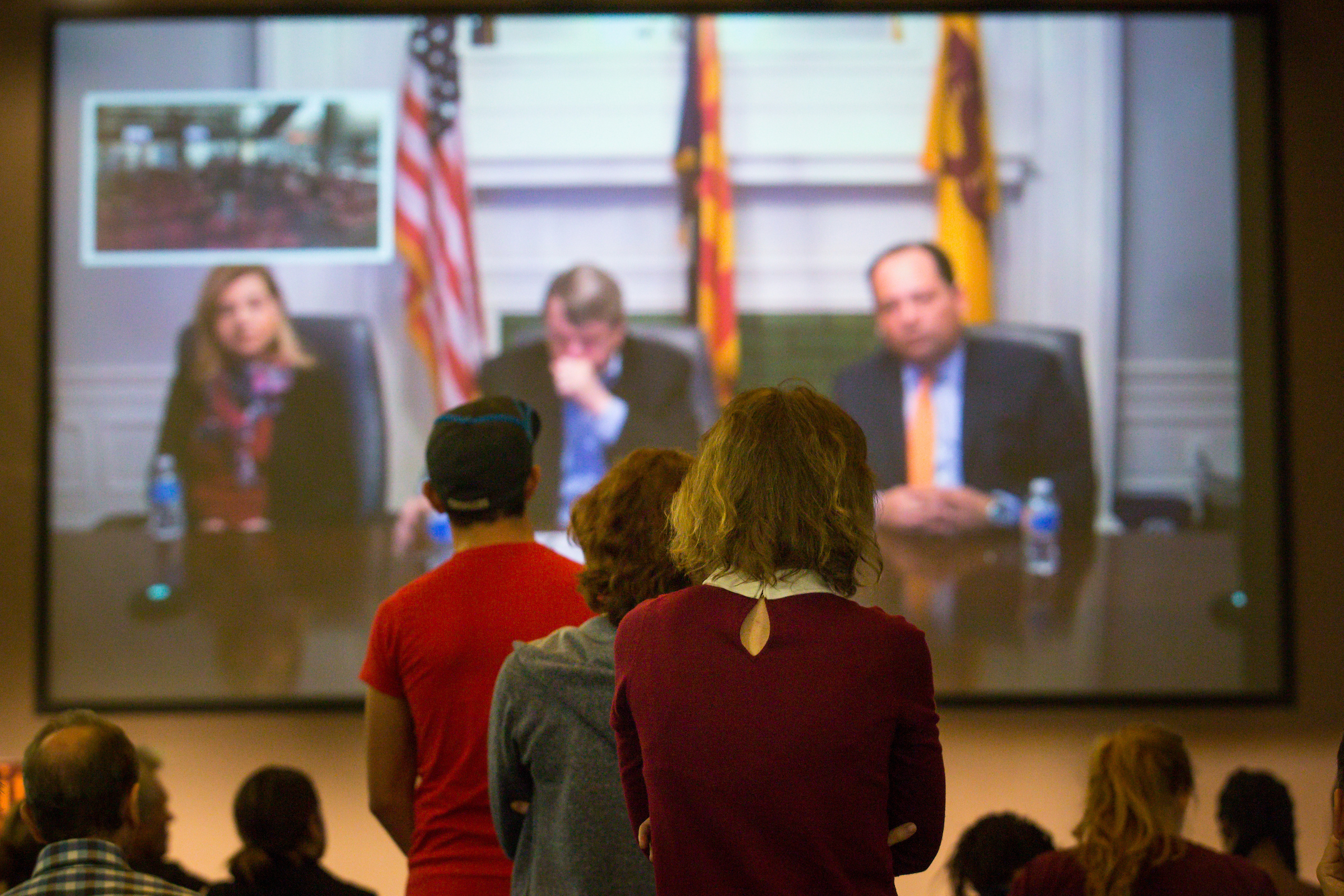 Photo: Students line up to ask questions of the team from The Washington Post — media columnist Margaret Sullivan, left, former executive editor and current Weil Family Professor of Journalism at Cronkite Leonard Downie Jr., and political reporter Philip Rucker — as they discuss the media's coverage in the 2016 presidential election. Sullivan, Downie and Rucker joined the Cronkite School from ASU's offices in Washington, D.C. Photo by Charlie Leight/ASU Now