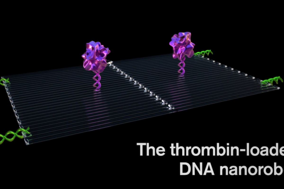 Each nanorobot is made from a flat, rectangular DNA origami sheet, 90 nanometers by 60 nanometers in size. A key blood-clotting enzyme, called thrombin, is attached to the surface.