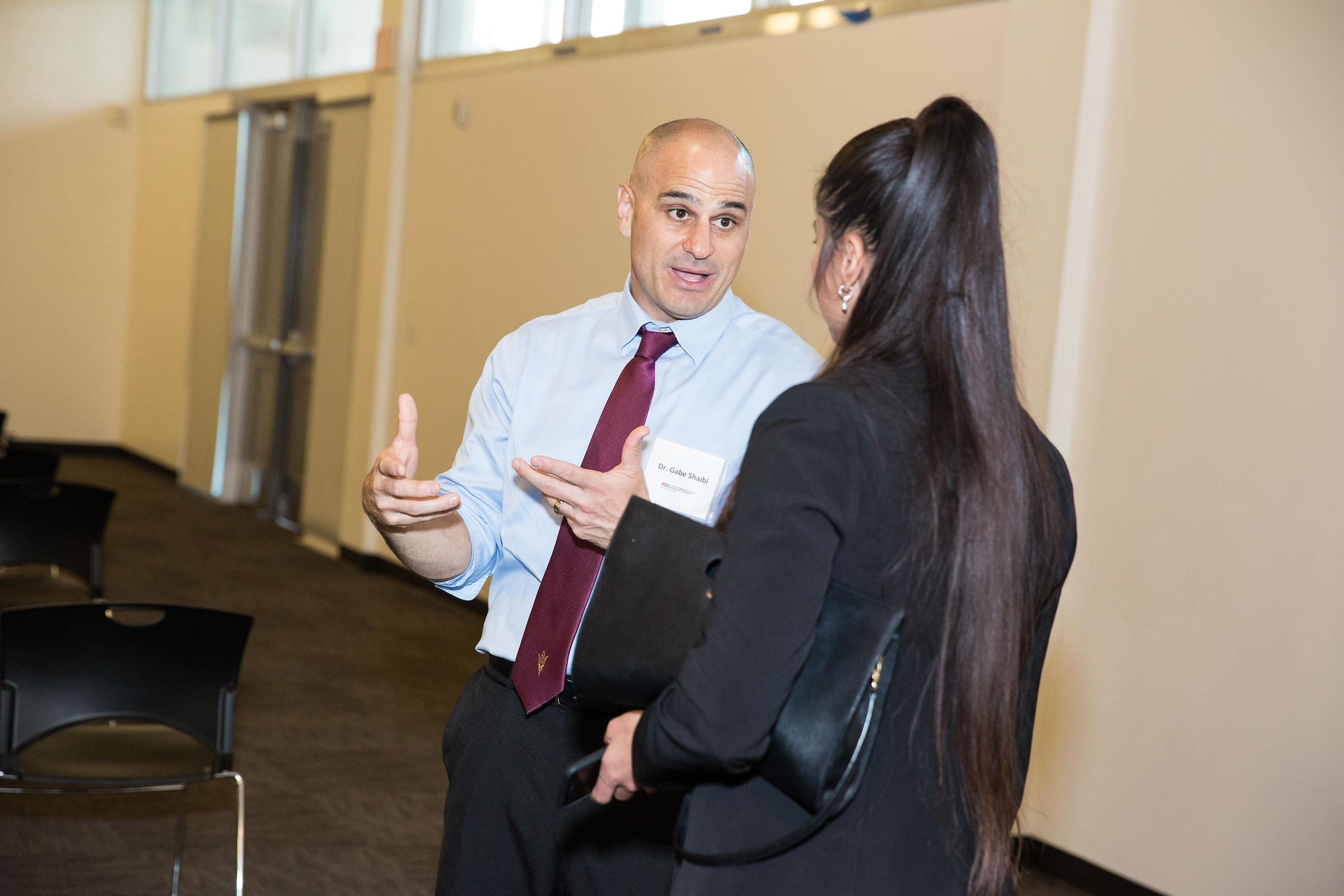 Top photo: Associate Professor Gabriel Shaibi speaks with Estela Barraza, MS program director for ASU Sun Devil Fitness, during an event at the A.E. England building on the Downtown Phoenix campus on March 15. Photo by Deanna Dent/ASU Now