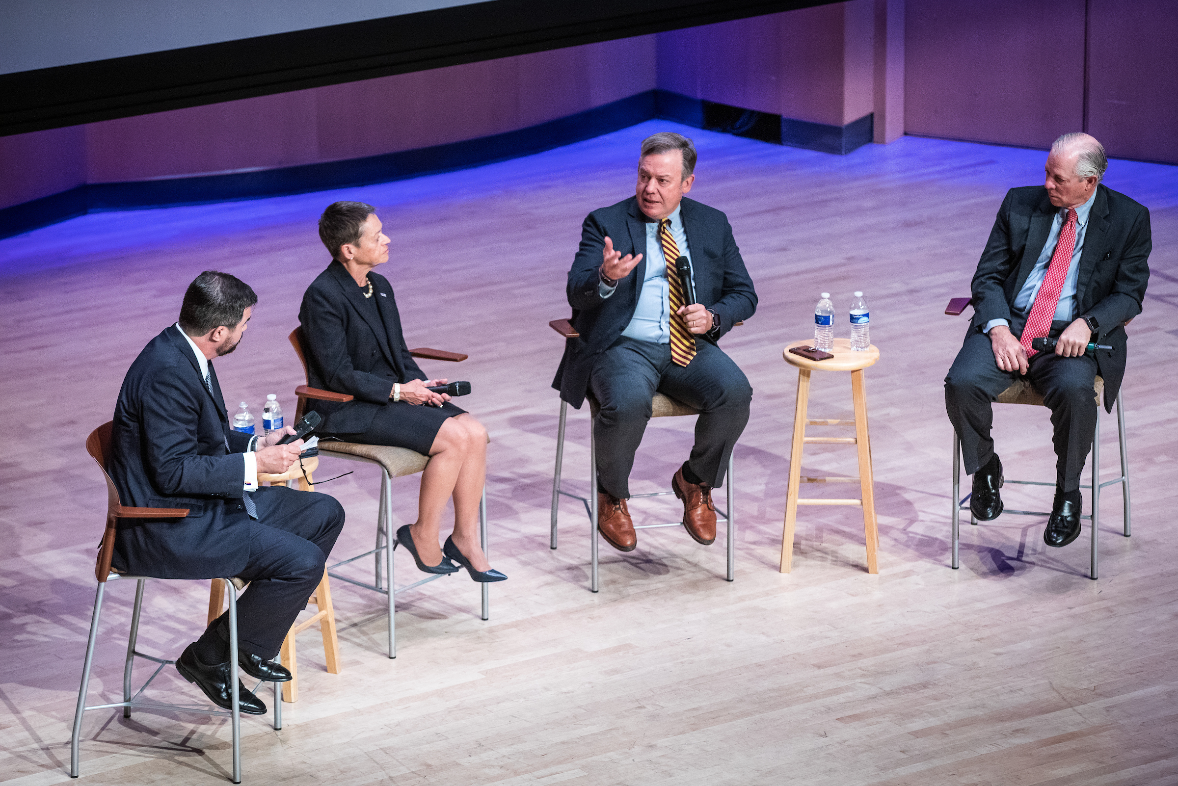 The "Valley Voices" event at the Musical Instrument Museum on Thursday, sponsored by the Greater Phoenix Chamber, included (from left) Jaime Molera, public affairs chairman for the chamber, who moderated the talk, NAU President Rita Cheng, ASU President Michael Crow and UArizona President Robert Robbins. Photo by Charlie Leight/ASU Now