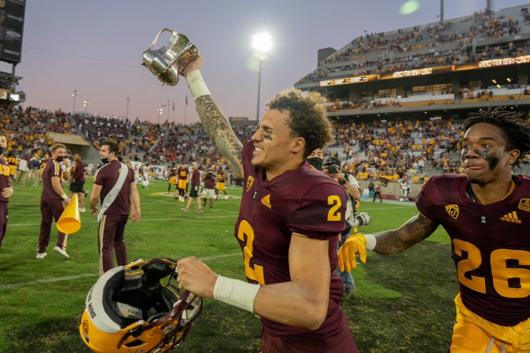 Top photo: Graduate student defensive back Deandre Pierce (2) holds the Territorial Cup after beating the University of Arizona Wildcats 38-15 at Sun Devil Stadium on Nov. 27. Photo by Samantha Chow/ASU News