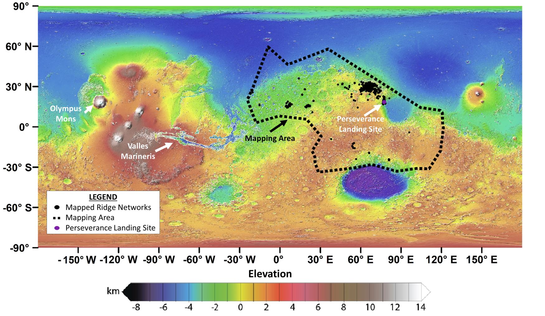 Map of polygonal ridge networks (black dots) identified in mapping area (dashed black outline), covering approximately a fifth of Mars’ total surface area. The Mars Perseverance rover landing site is shown in purple. Background: Mars Orbiter Laser Altimeter Elevation Map. Credit: NASA/JPL/GSFC.