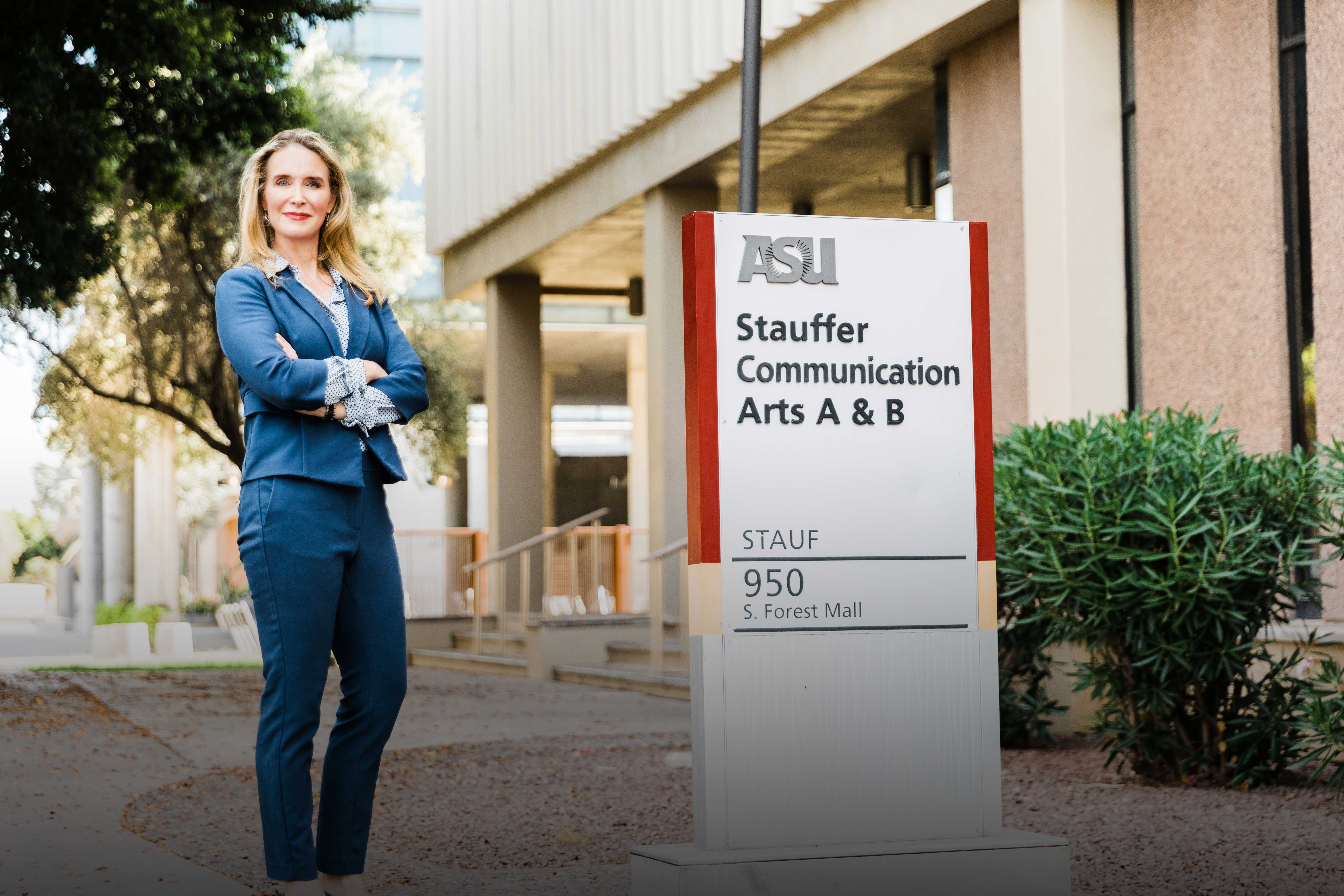 Top photo: Sarah J. Tracy in front of Stauffer Hall, home of the Hugh Downs School of Human Communication.
