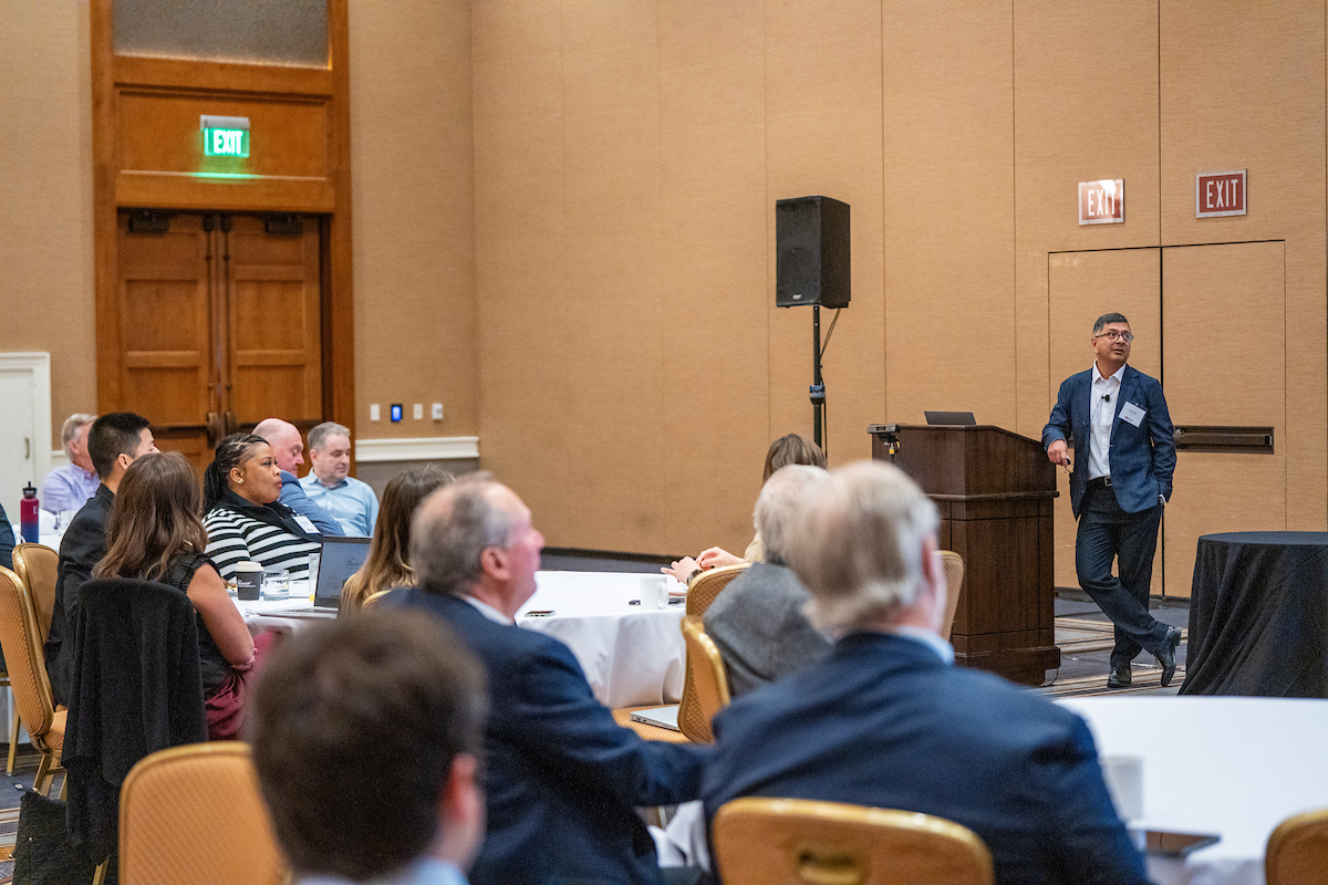 Sunil Wahal, professor and director of the Center for Responsible Investing, talks to attendees at the center's inaugural conference. Photo courtesy the W. P. Carey School of Business/ASU