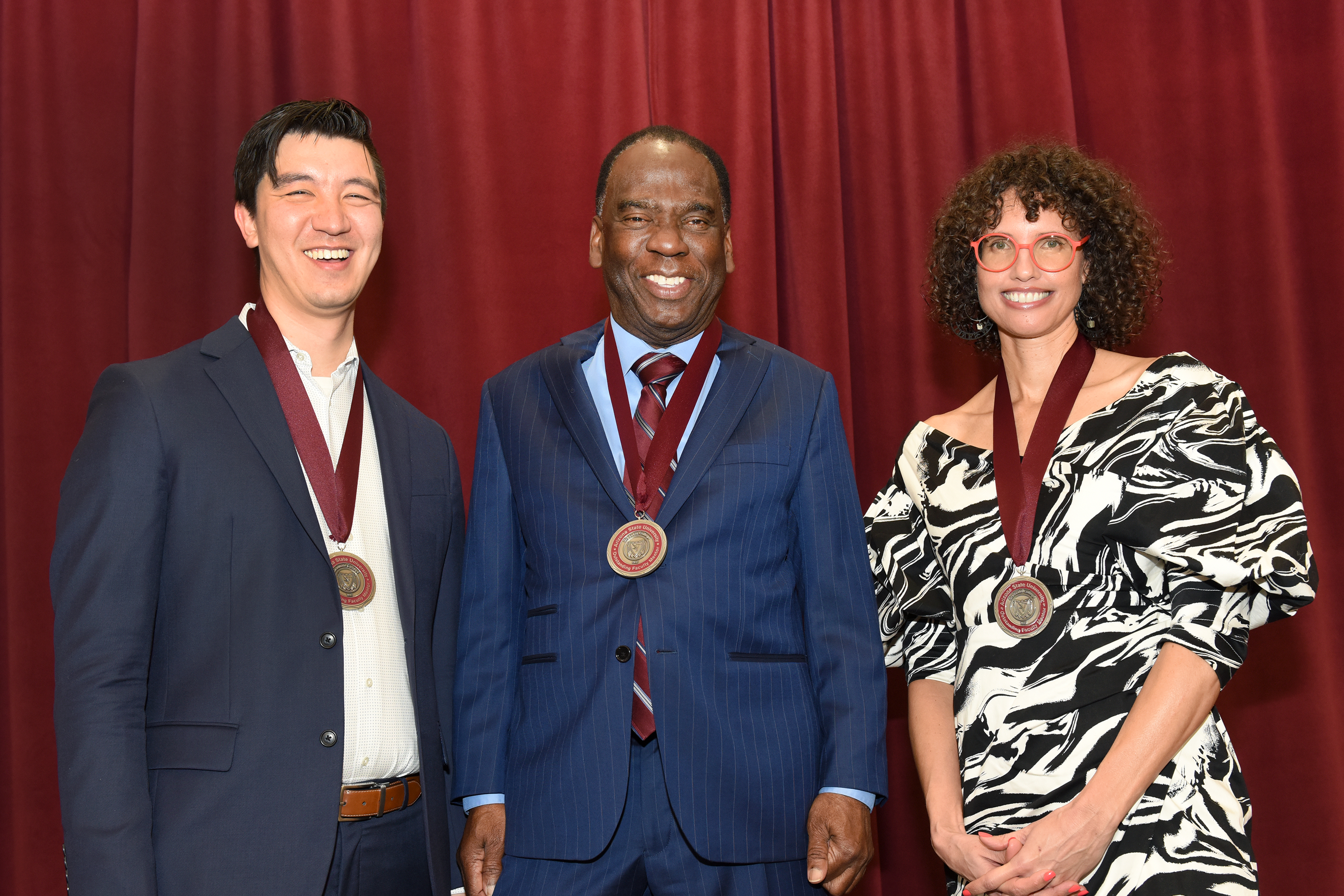 The 2024–25 Outstanding Faculty Mentor Award recipients at Old Main’s Carson Ballroom. From left: Joshua Daymude, Outstanding Master’s Mentor; Jeffrey Wilson, Outstanding Postdoctoral Mentor; and Kelly Jackson, Outstanding Doctoral Mentor. Photo by Tim Trumble