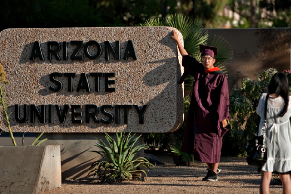 It's that time of the year where commencement ceremonies and convocations mark a transition for more than 10,000 graduates – to go from ASU student to alum. Following his commencement ceremony, Paul Yue poses for a photo by the ASU sign on University Drive. Yue received a master’s in industrial engineering.