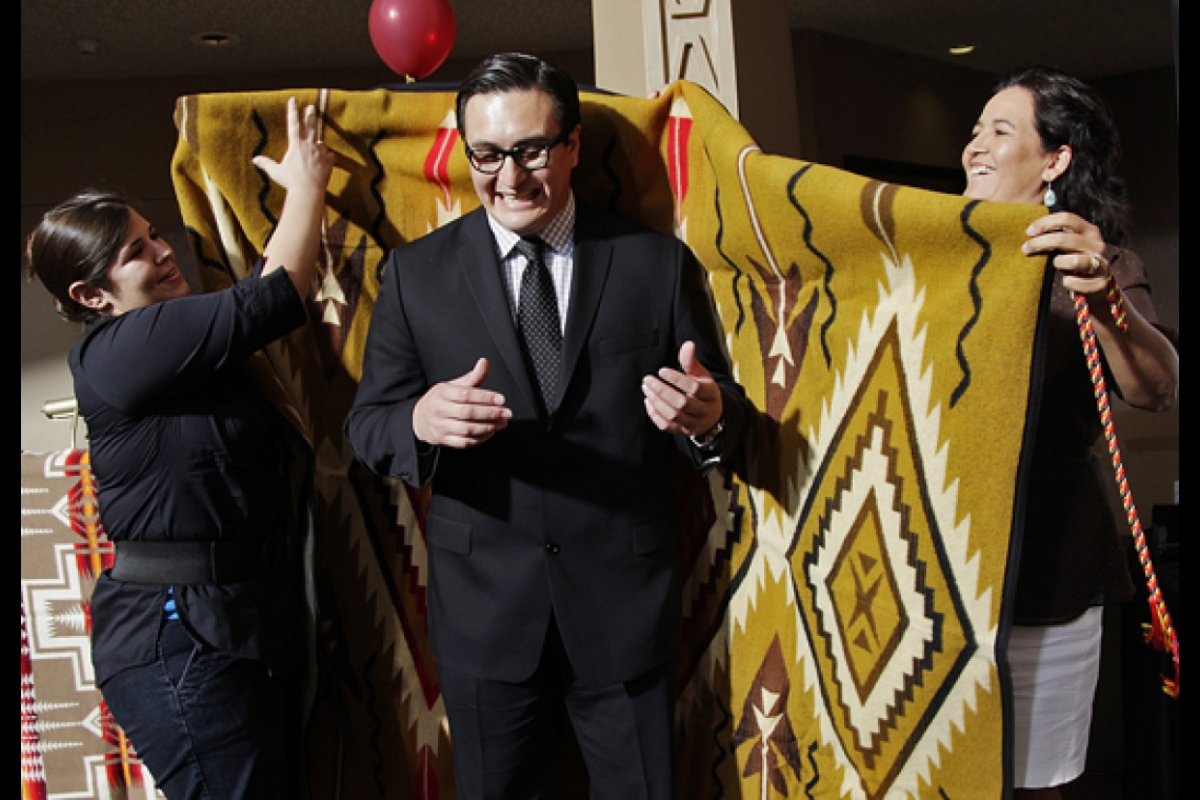 Khia Grinnell, second-year law student (left) and Kate Rosier (right), director of the Indian Legal Program (ILP) at the Sandra Day O'Connor College of Law, present Julian Nava with a blanket during the ILP's annual blanket ceremony for graduating law students in the program.