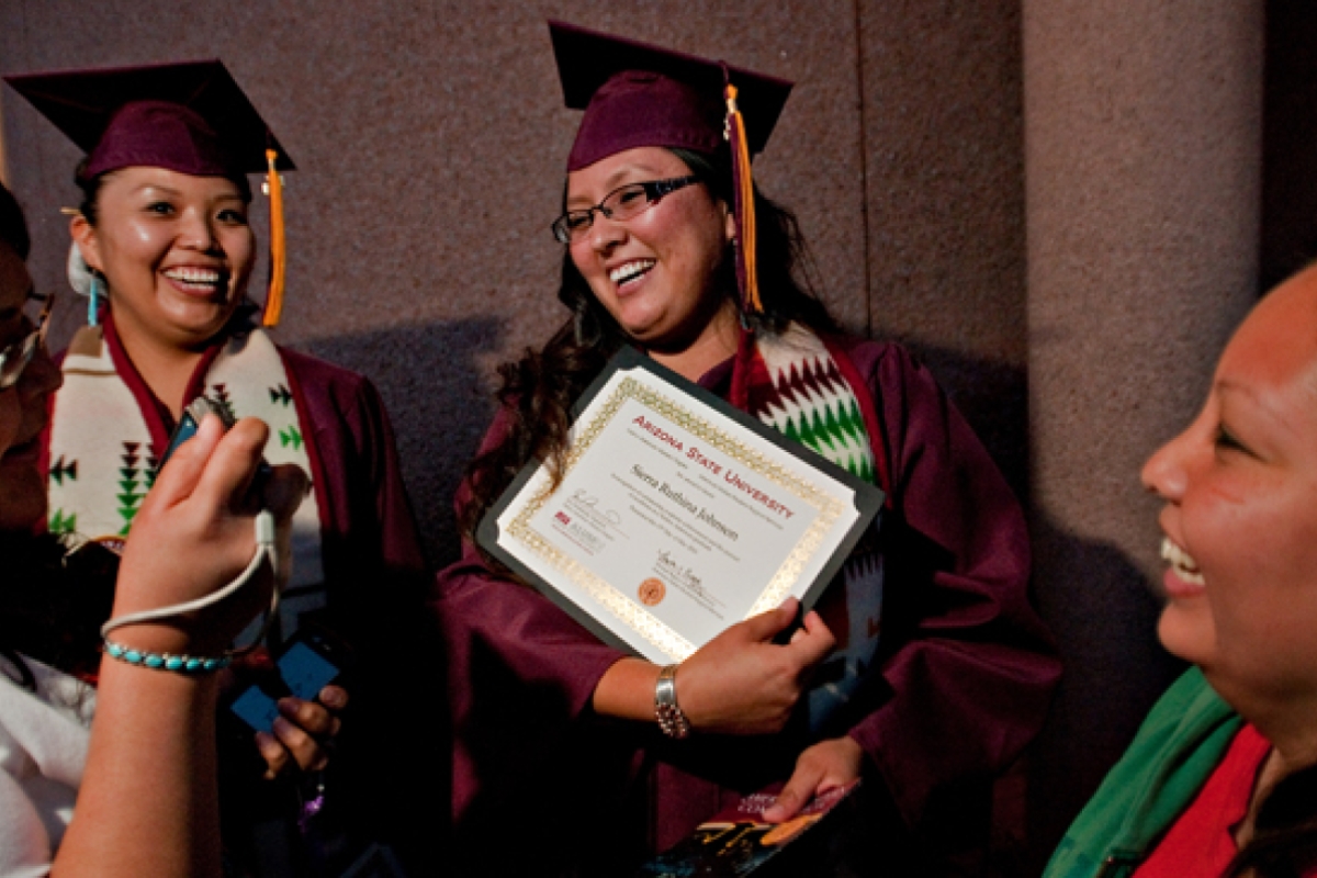 Sierra Johnson holds her diploma so that friends can photograph it following the American Indian Convocation at ASU’s Grady Gammage Auditorium. Johnson’s degree was in graphic information technology.