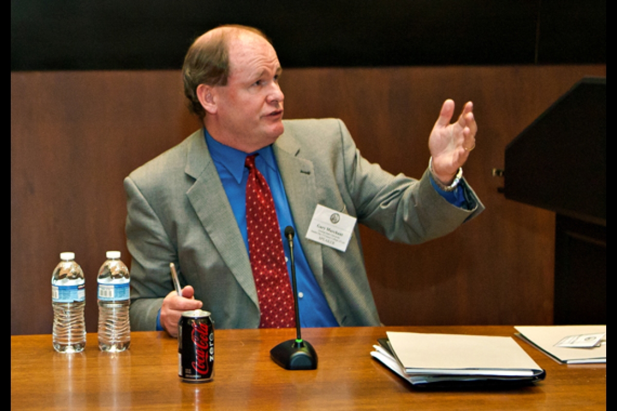 Gary Marchant discusses gene doping and drug testing during a panel at the second annual Sports and Entertainment Law Conference that took place Nov. 5, at the Sandra Day O’Connor College of Law. Marchant, executive director of the Center for Law, Science & Innovation, was among experts who gave talks on collective bargaining, protecting intellectual property on the Web, publicity v. defamation, sports team bankruptcies and other sports and entertainment topics.
